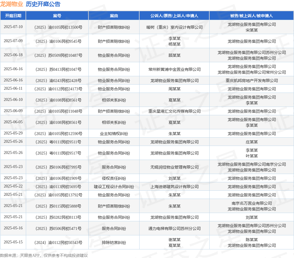 本站消息,根据天眼查APP显示,近日公布了一则龙湖物业服务集团有限公司作为被告/被上诉人的开庭公告,详细内容如下: